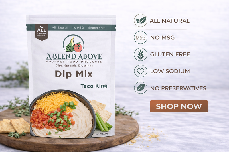 Our Taco King Dip Mix is an all-natural, keto-friendly seasoning blend designed to create zesty, savory dips or taco meat. It features a robust blend of chili pepper, onion, garlic, paprika, and spices, with no MSG, preservatives, or gluten. It is typically prepared by mixing with equal parts sour cream and mayonnaise.