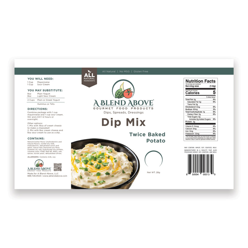 Our Twice Baked Potato Dip Mix is a savory, comfort food seasoning blending cheddar cheese, bacon, chives, sour cream notes, and onion to mimic a loaded potato. It creates a thick, creamy appetizer dip when mixed with sour cream and mayonnaise, perfect for chips, veggies, or crackers.